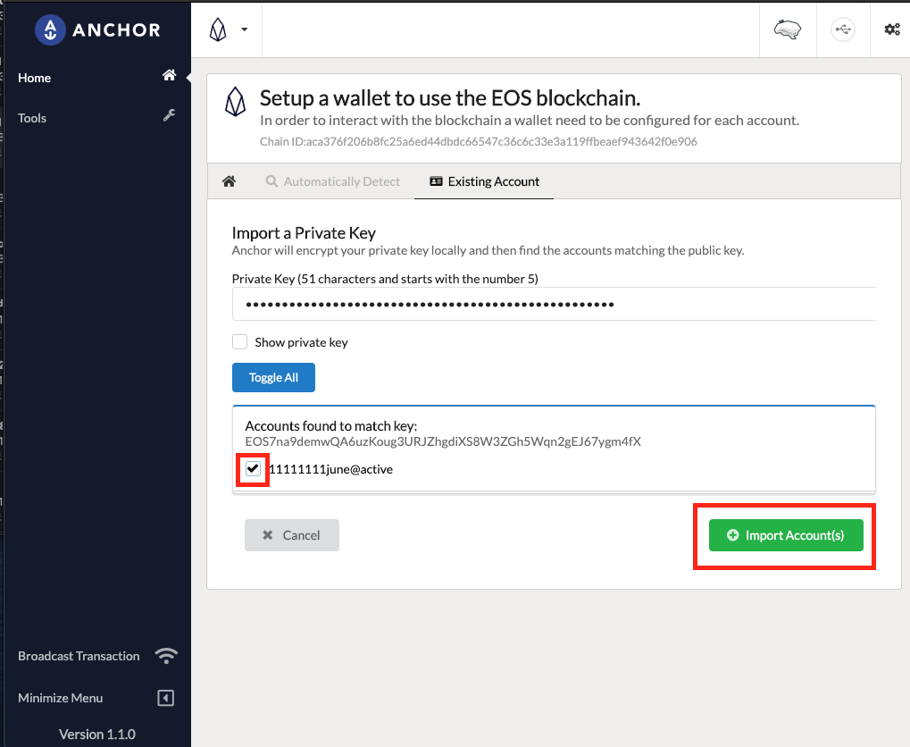 9. 정상적으로 프라이빗키를 입력하시면 위 화면과 같이 체크박스와 초록색 버튼을 눌러주세요.